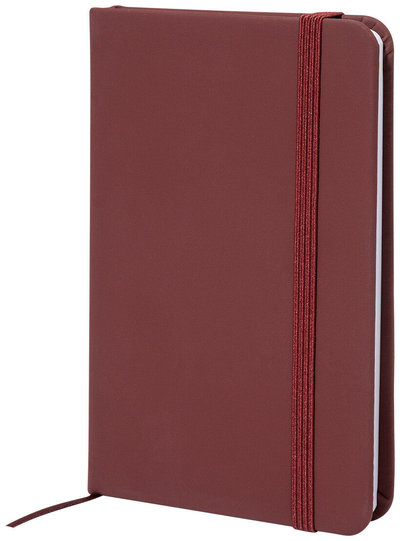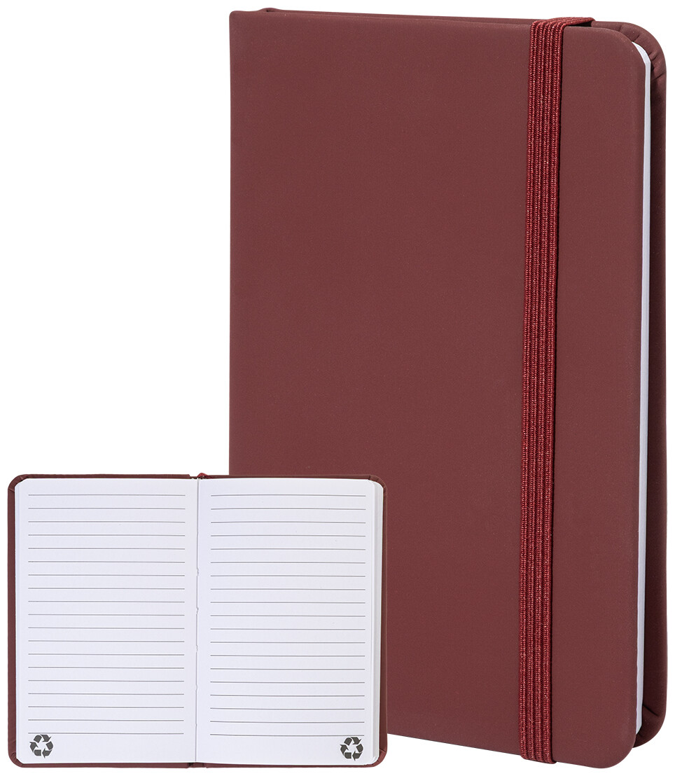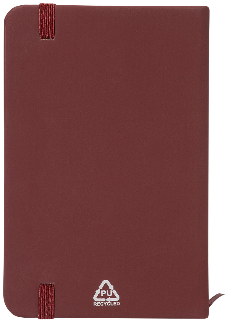 Blok potažený recyklovanou PU kůží se 100 linkovanými listy z recyklovaného papíru. Se záložkou v odpovídající barvě a gumičkou. Velikost A6.