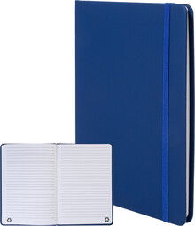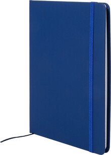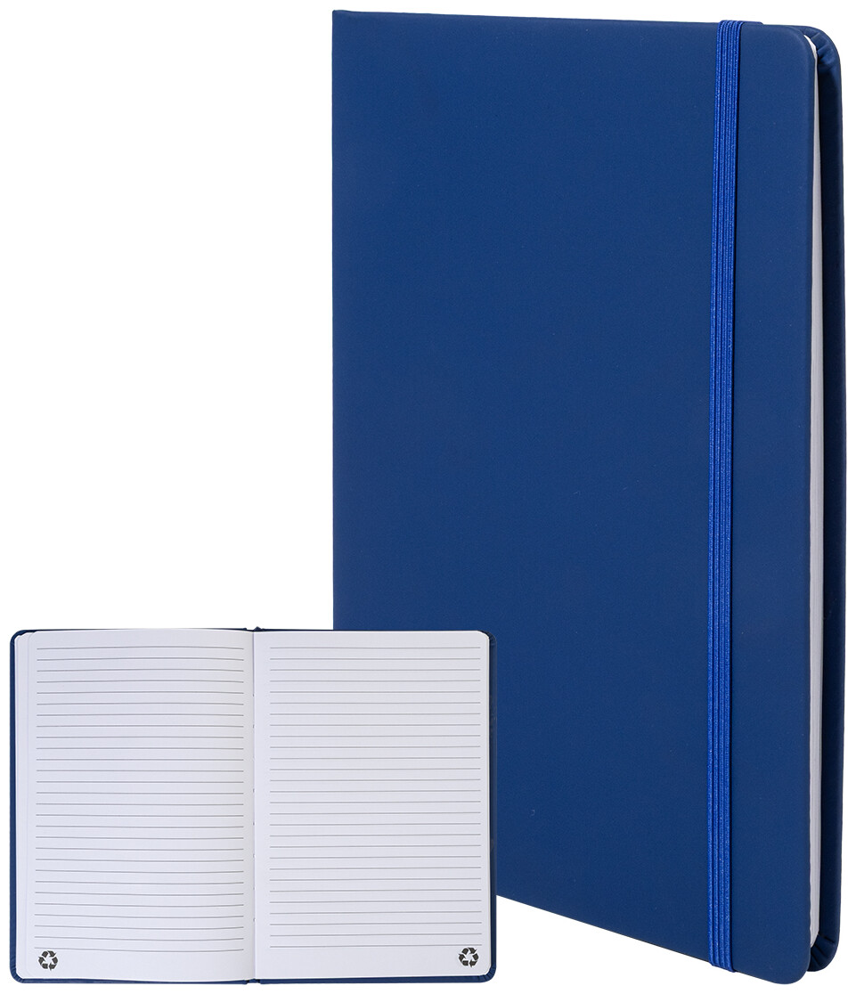 Blok potažený recyklovanou PU kůží se 100 linkovanými listy z recyklovaného papíru. Se záložkou v odpovídající barvě a gumičkou. Velikost A5.