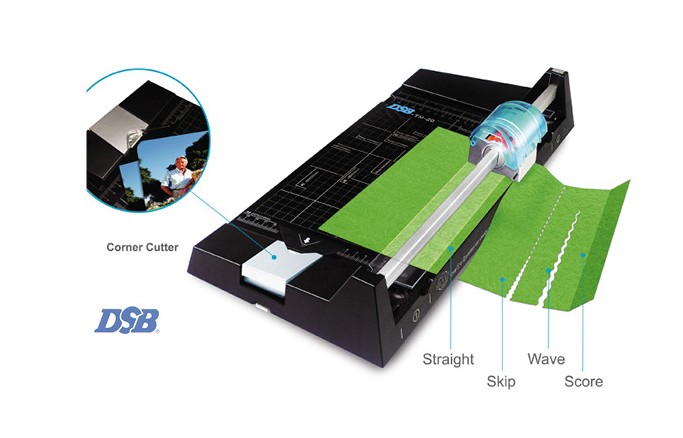 Kotoučová řezačka 5v1 vhodná na kancelářské i domácí použití. Pouze otáčením kolečka průhledné řezací hlavy se mění typ řezu na rovný (max. 5 listů), vlnkový (max. 3 listy), dírkovaný (perforace - max. 3 listy), nebo lze i rýhovat. Ve stabilní konstrukci stolu řezačky je vestavěn jednoduchý zaoblovač rohů. Plocha řezačky je potištěna měřidly a formáty papírů. Délka řezu 320 mm.