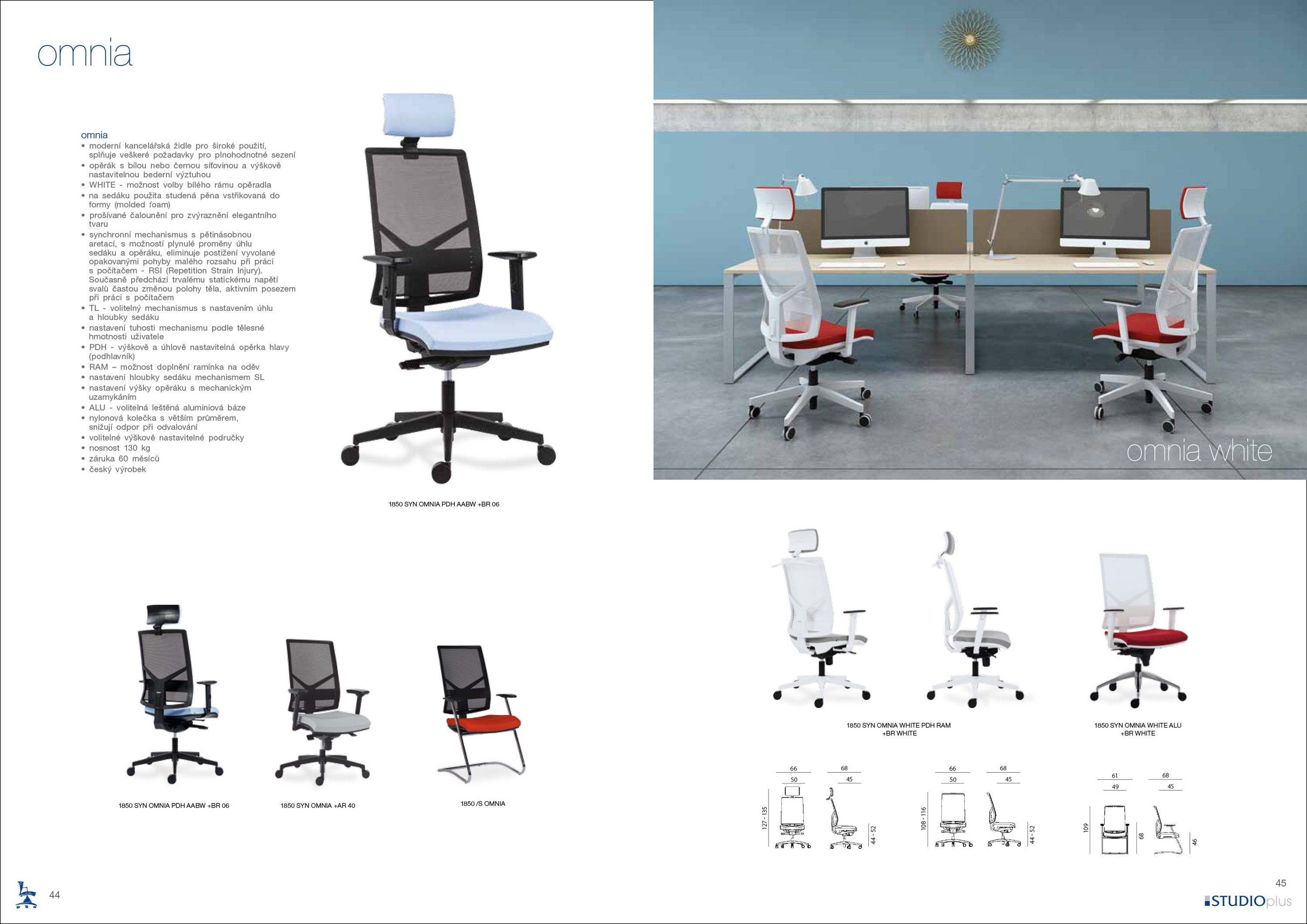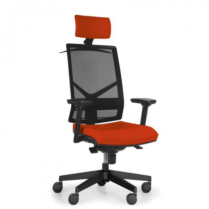 židle s vysokým síťovaným opěrákem a výškově nastavitelnou bederní výztuhou, volitelný podhlavník se sítí nebo čalounem výškově a uhlově nastavitelný, možnost doplnění ramínka na oděv, nastavení výšky opěráku s uzamykáním, čalounění ze studené pěny, nový design sedáku s výrazným zaoblením přední hrany a robustní výškou pro maximální pohodlí synchronní mechanismus s čtyřnásobnou aretací, automatickým nastavením síly protiváhy a nastavením hloubky sedáku, plastová báze, kolečka pr. 60 mm pro měkké podlahy, volitelné područky, nosnost 150 kg, český výrobek, záruka 60 měsíců