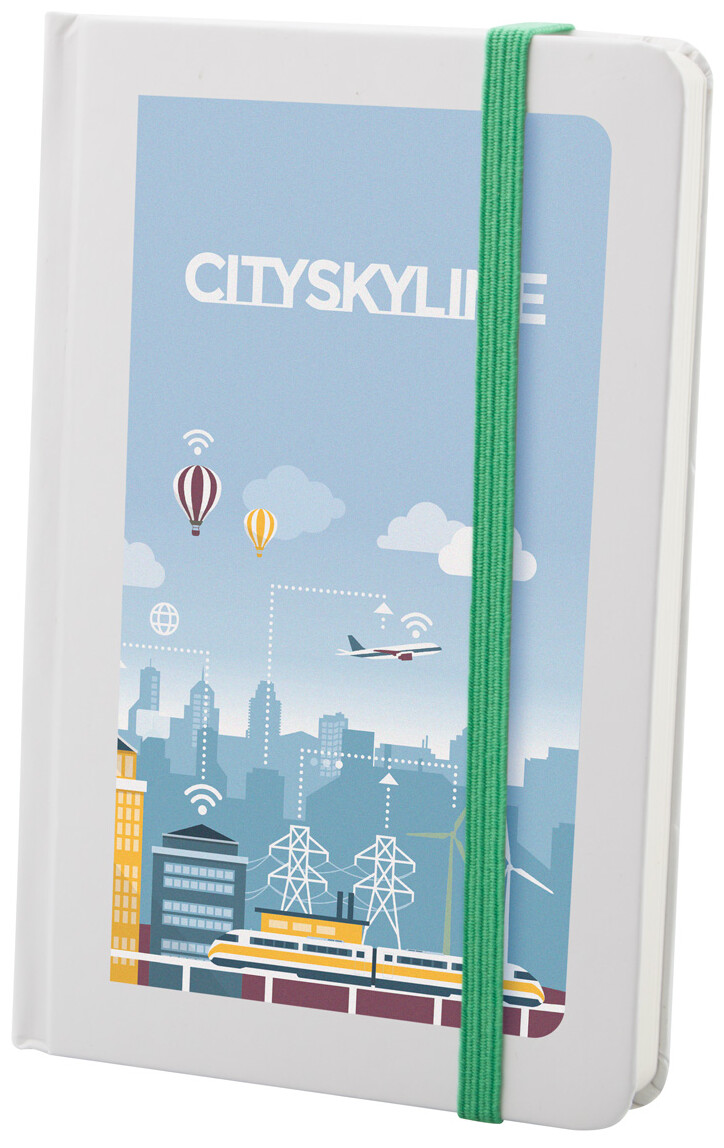 Poznámkový blok s bílými deskami, 80 čistými listy a barevnou gumičkou. Velikost A6.