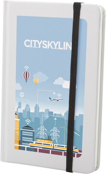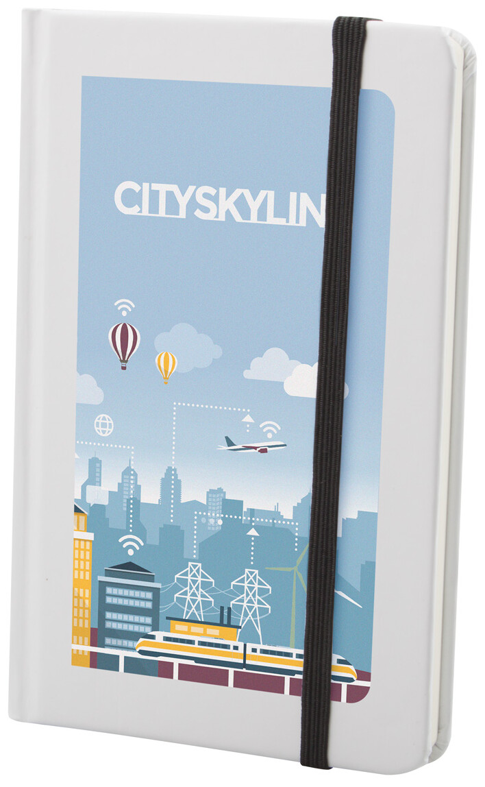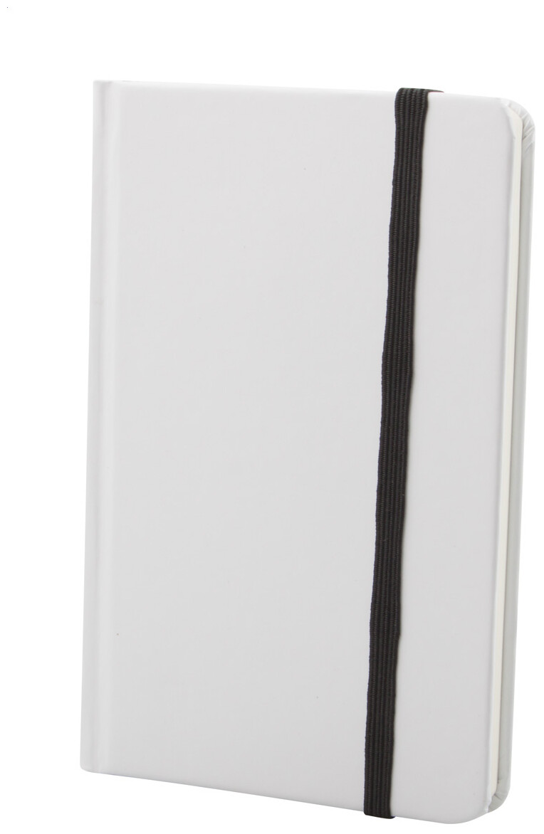 Poznámkový blok s bílými deskami, 80 čistými listy a barevnou gumičkou. Velikost A6.
