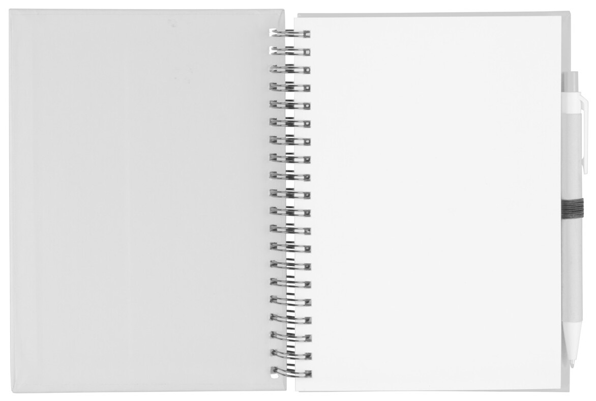 Poznámkový blok se 70 čistými listy a spirálovou vazbou v kartonových deskách, vč. stejně barevného kuličkového pera z recyklovaného papíru s modrou náplní.