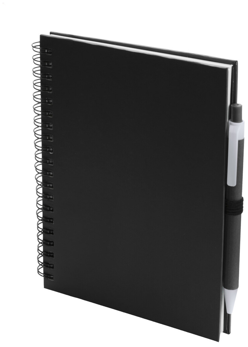 Poznámkový blok se 70 čistými listy a spirálovou vazbou v kartonových deskách, vč. stejně barevného kuličkového pera z recyklovaného papíru s modrou náplní.