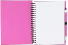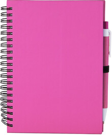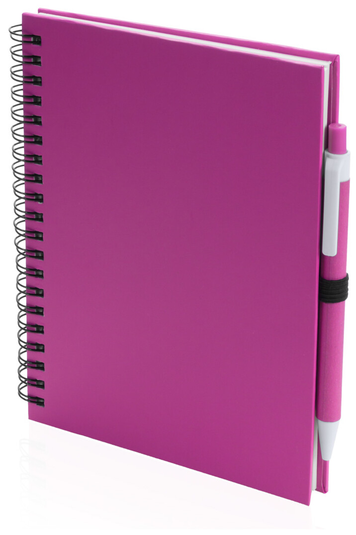 Poznámkový blok se 70 čistými listy a spirálovou vazbou v kartonových deskách, vč. stejně barevného kuličkového pera z recyklovaného papíru s modrou náplní.