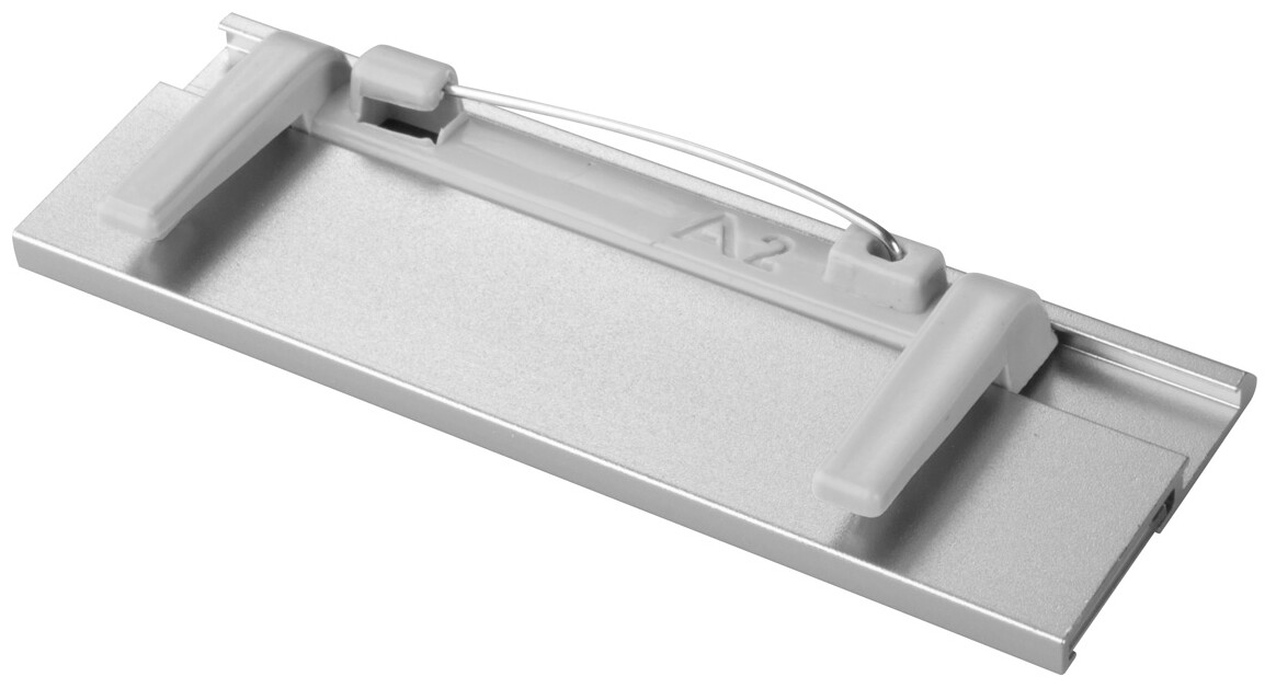 Hliníková jmenovka s vyměnitelnými papírovými a plastovými díly.