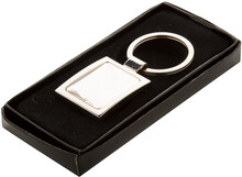 Kovový přívěšek na klíče v krabičce z černého kartonu.
