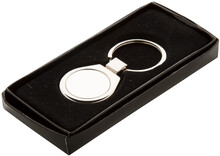 Kovový přívěšek na klíče v krabičce z černého kartonu.
