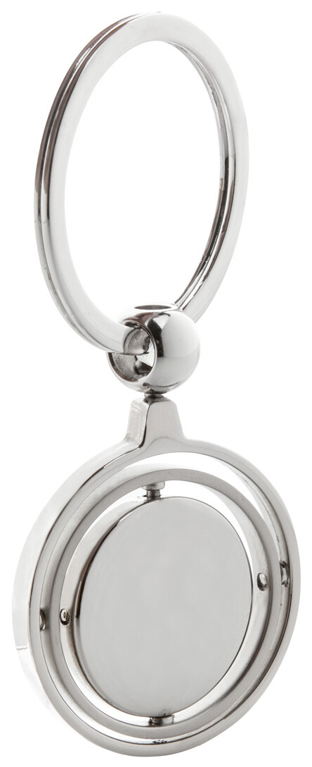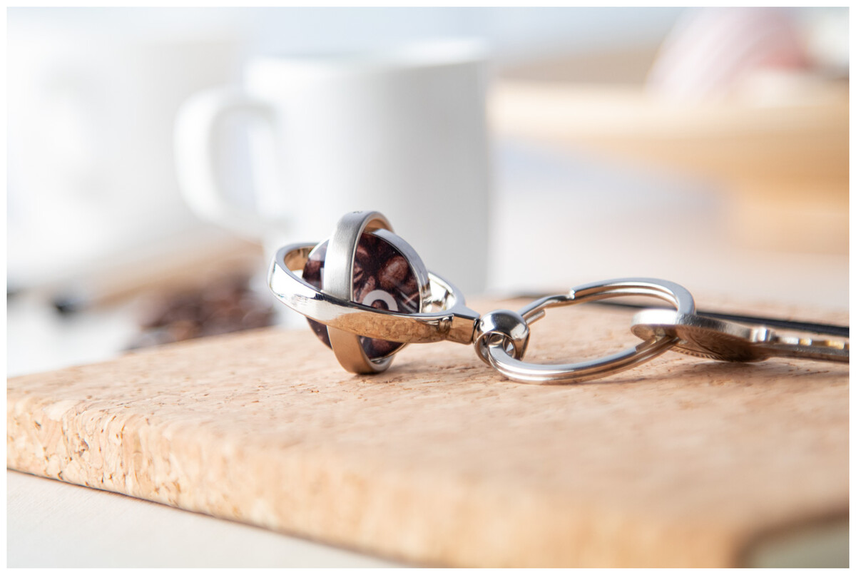 Přívěšek na klíče s otočnou vnitřní částí v černé kartonové krabičce.