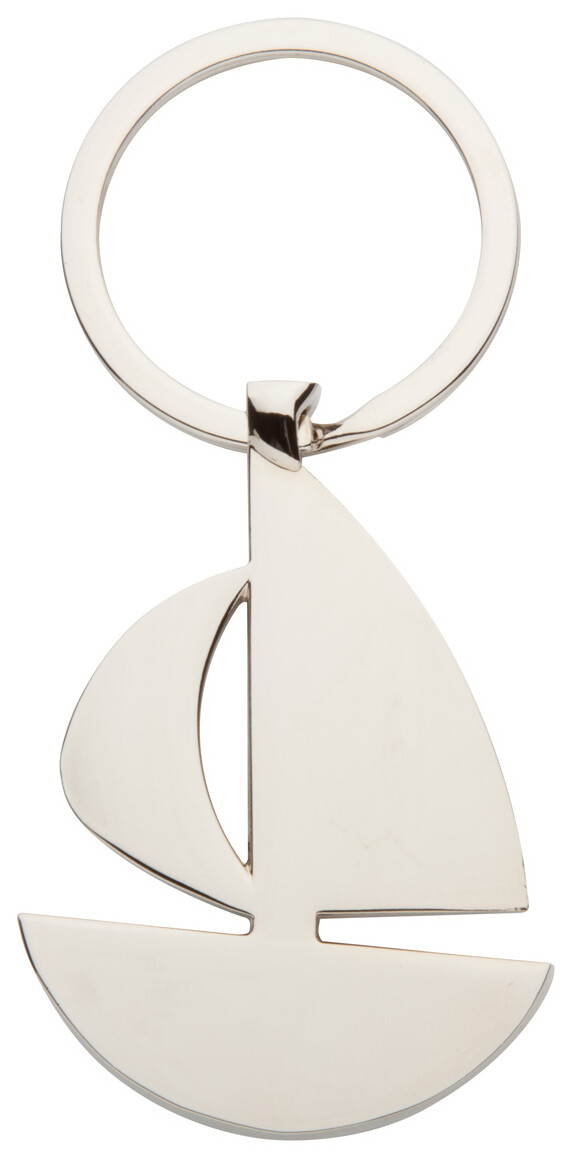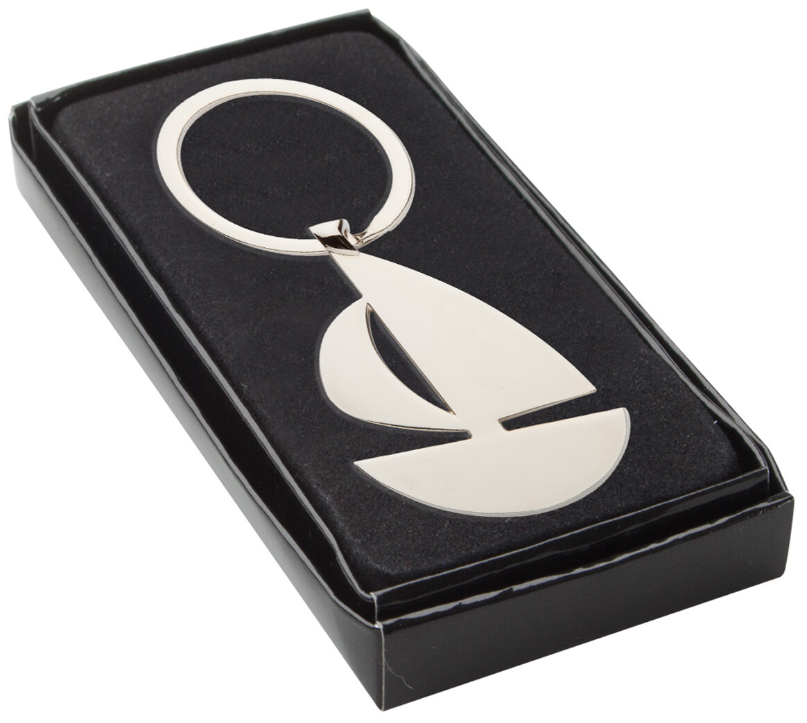 Kovový přívěšek na klíče ve tvaru plachetnice v krabičce z černého kartonu.