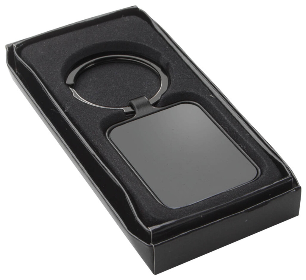 Obdélníkový přívěšek na klíče v barvě gun metal s oboustranným lesklým povrchem.