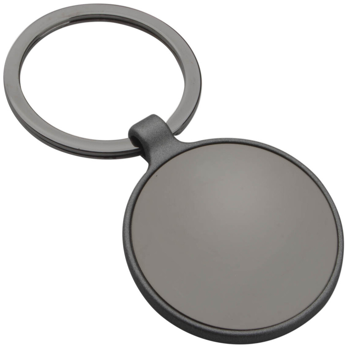Kulatý přívěšek na klíče v barvě gun metal s oboustranným lesklým povrchem.