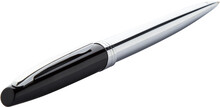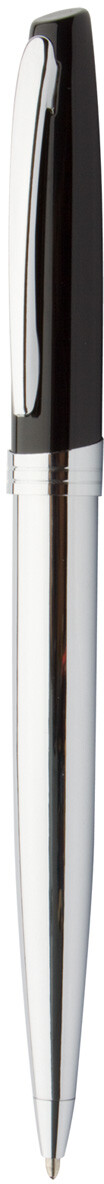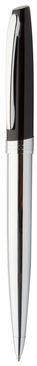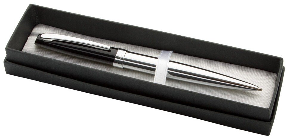 Kuličkové pero s pevným, lesklým pochromovaným tělem, s modrou náplní. Dodáváno v dárkové krabičce.