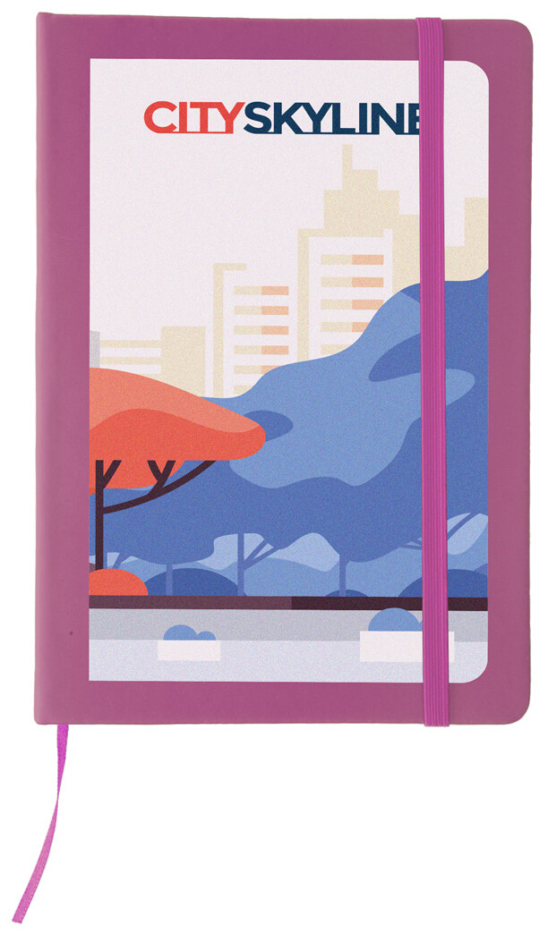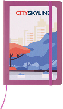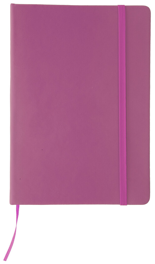 Poznámkový blok se 100 listy, záložkou a gumičkou.