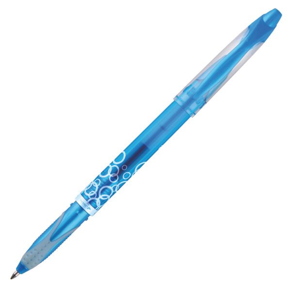 Mazací gelové pero. Vroubkovaný pogumovaný úchop neklouže, zajišťuje pevné a příjemné držení. Odolný kónický hrot a kvalitní plastové tělo. Mazací termo inkoust v modré barvě mizí při zahřátí na 60°C a při -15°C se znovu objevuje. Zahřátí docílíte pomocí pryže. Vyměnitelná náplň. Možnost dokoupení extra pryže. Šířka stopy 0,5 mm. Barva těla: světle modrá.