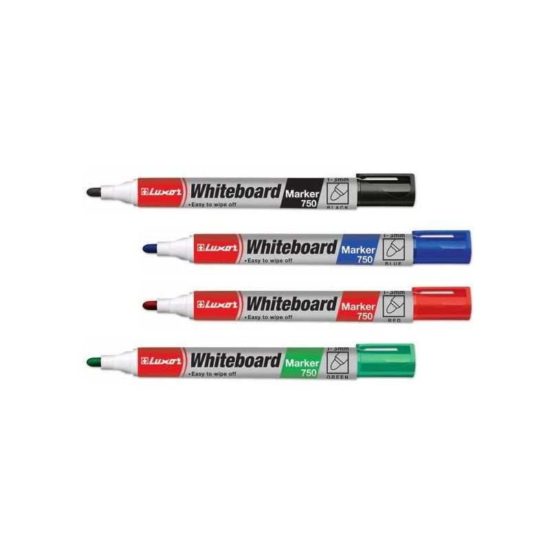 Popisovač LUXOR 750, je velmi kvalitní, vybaven kulatým hrotem a snadno stíratelným inkoustem, neobsahuje Toluen ani Xylen a díky tomu nezapáchá. Ideální na popisování tabulí a všech hladkých povrchů ze kterých text pak jednoduše smažete. Šíře stopy 1-3 mm dle tlaku. Víčko s klipem umožní připnutí na desky nebo papír, zabraňuje také kutálení fixu z povrchů pryč. Za dobrých podmínek vydrží popisovač až 72 hodin bez víčka, Doporučujeme však pokaždé uzavřít.