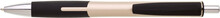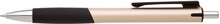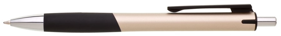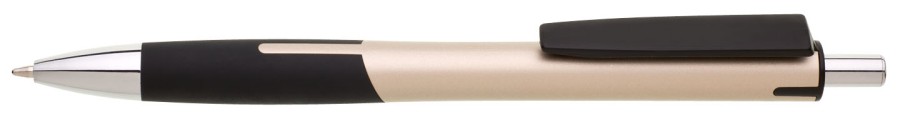 Plastová propiska CHANEL zlatá s černým, pogumovaným gripem a širokým plastovým, černým klipem vhodný pro potisk. Cvakátko a špička je pochromovaná. Náplň X20 -110 mm.