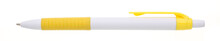 Propiska s bílým tělem, žlutým gripem a klipem, náplň modře píšící.