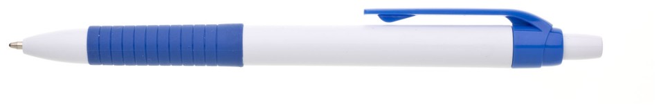 Propiska s bílým tělem, modrým gripem a klipem, náplň modře píšící.