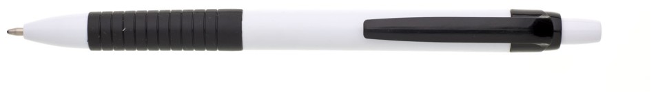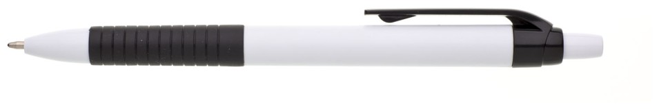 Propiska s bílým tělem, černým gripem a klipem, náplň modře píšící.