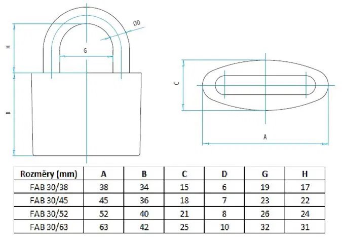 Visací zámek FAB o průměru 63 mm je určen k uzamykání skříněk, branek, kůlen či jiných uzavíracích systémů. Kvalitní kovové tělo a pevný třmen zajišťují vysokou úroveň bezpečnosti a dlouhou životnost.