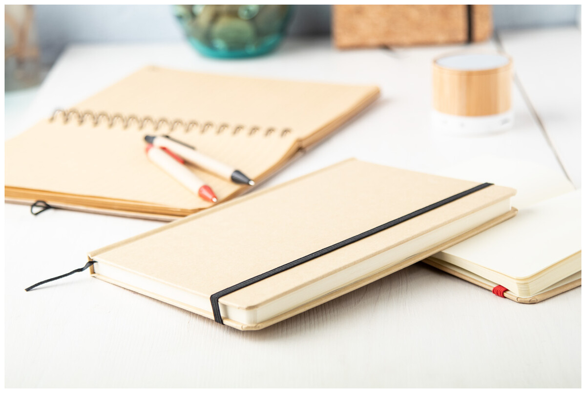 Blok s deskami potaženými recyklovaným kartonem se 100 čistými listy, barevnou záložkou a gumičkou.