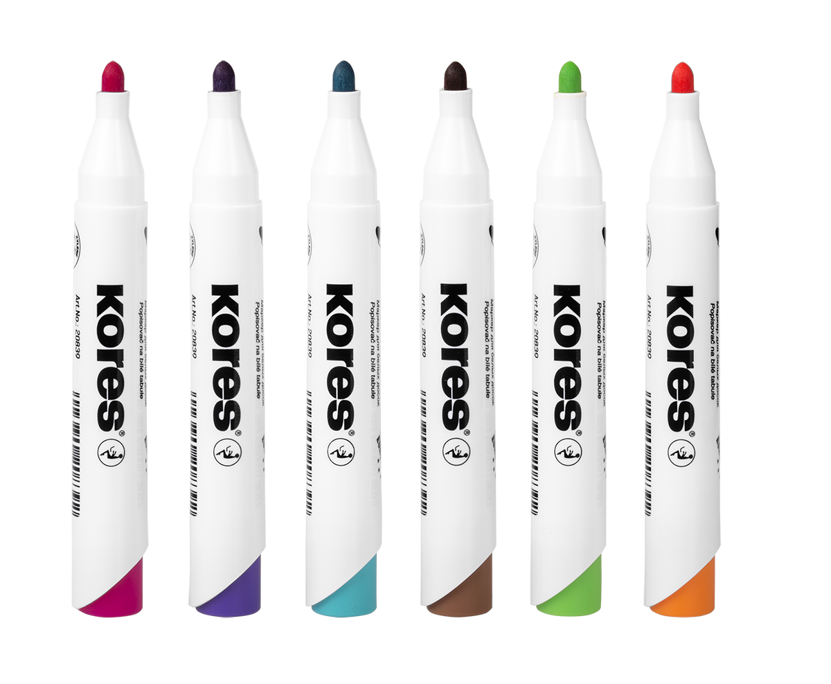 Popisovač na bílé tabule a flipcharty vysoké kvality. Unikátní design. Plynulý tok inkoustu pro jemné a pohodlné psaní. Vydrží bez víčka min. 48 hod. Nezanechávají po smazání žádné stopy. Netoxické – neobsahují xylen, toluen a benzen. Vyrobeno v ČR. V sadě 6 barev - růžová, tyrkysová, oranžová, hnědá, fialová, světle zelená.