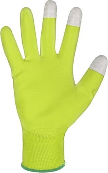 Pletené bezešvé rukavice z polyesteru, s tenkou vrstvou polyuretanu v dlani a na prstech.V koncích palce, ukazováčku a prostředníku měděné vlákno pro práci s dotykovými displeji.