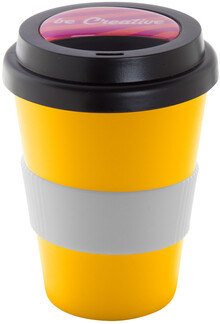 Dvoustěnný plastový termo hrnek s víčkem na pití a silikonovým úchopem na zakázku. 300 ml. Min. mn.: 50 ks.