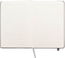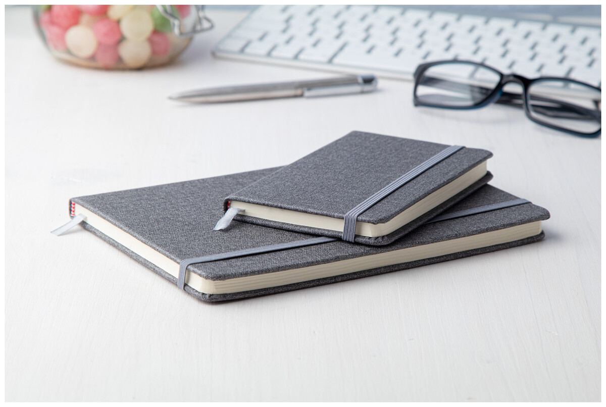 Blok A5 s deskami ze strukturované PU kůže, s gumičkou a 80 listým linkovaným blokem.