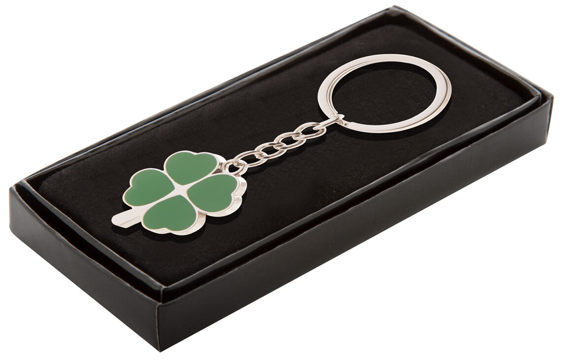 Přívěšek na klíče ve tvaru čtyřlístku. V černé dárkové krabičce.
