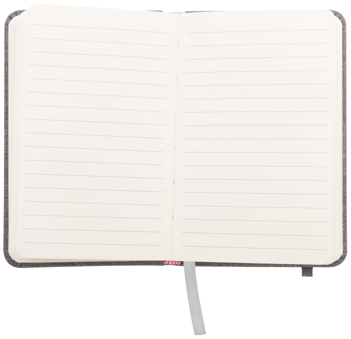 Blok A6 s deskami ze strukturované PU kůže, s gumičkou a 80 listým linkovaným blokem.